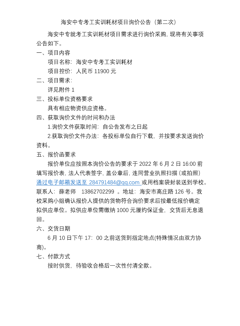 2022年海安中专考工实训耗材项目询价公告(第二次)