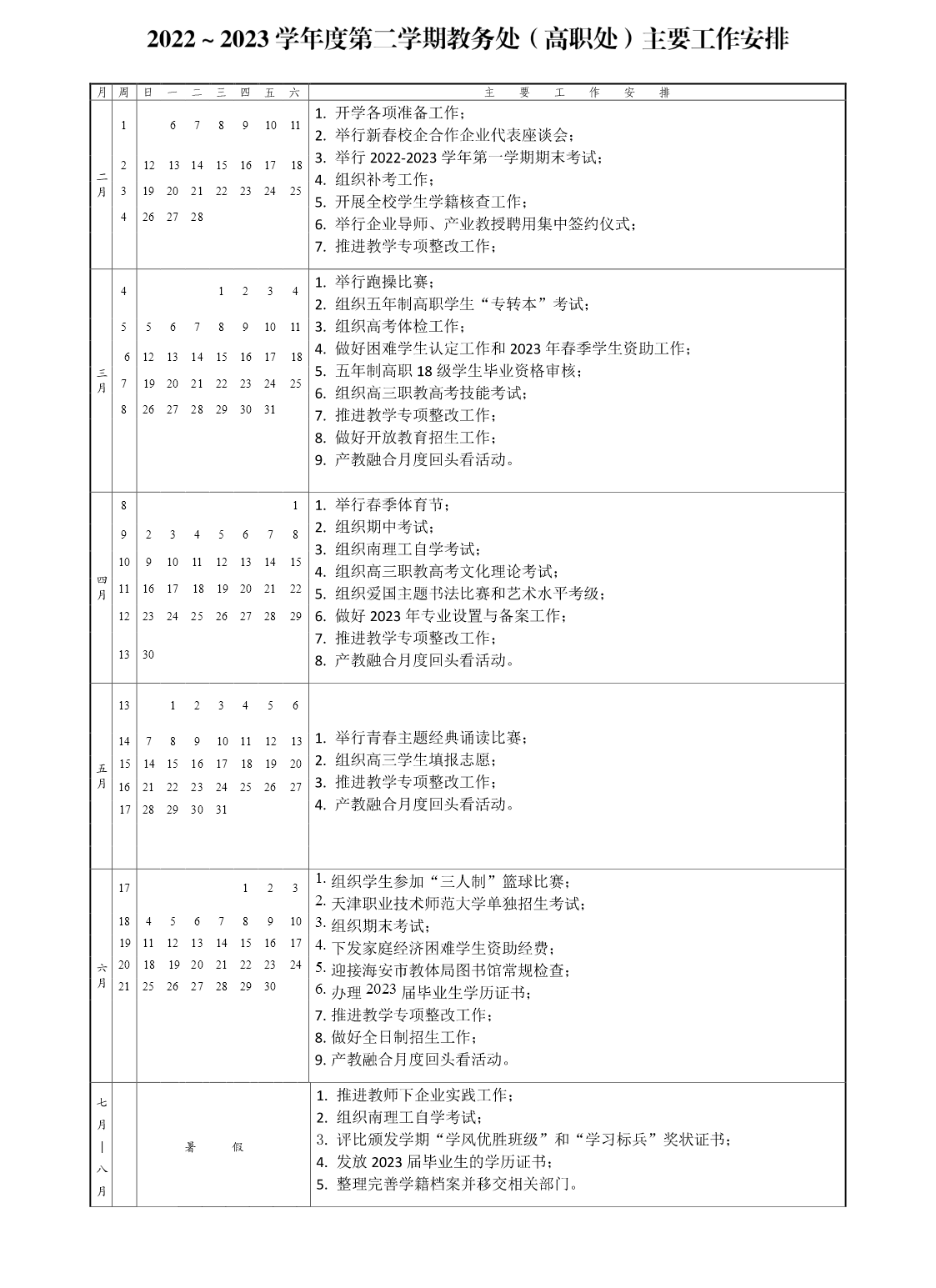 2022~2023学年度第二学期教务处(高职处)主要工作安排