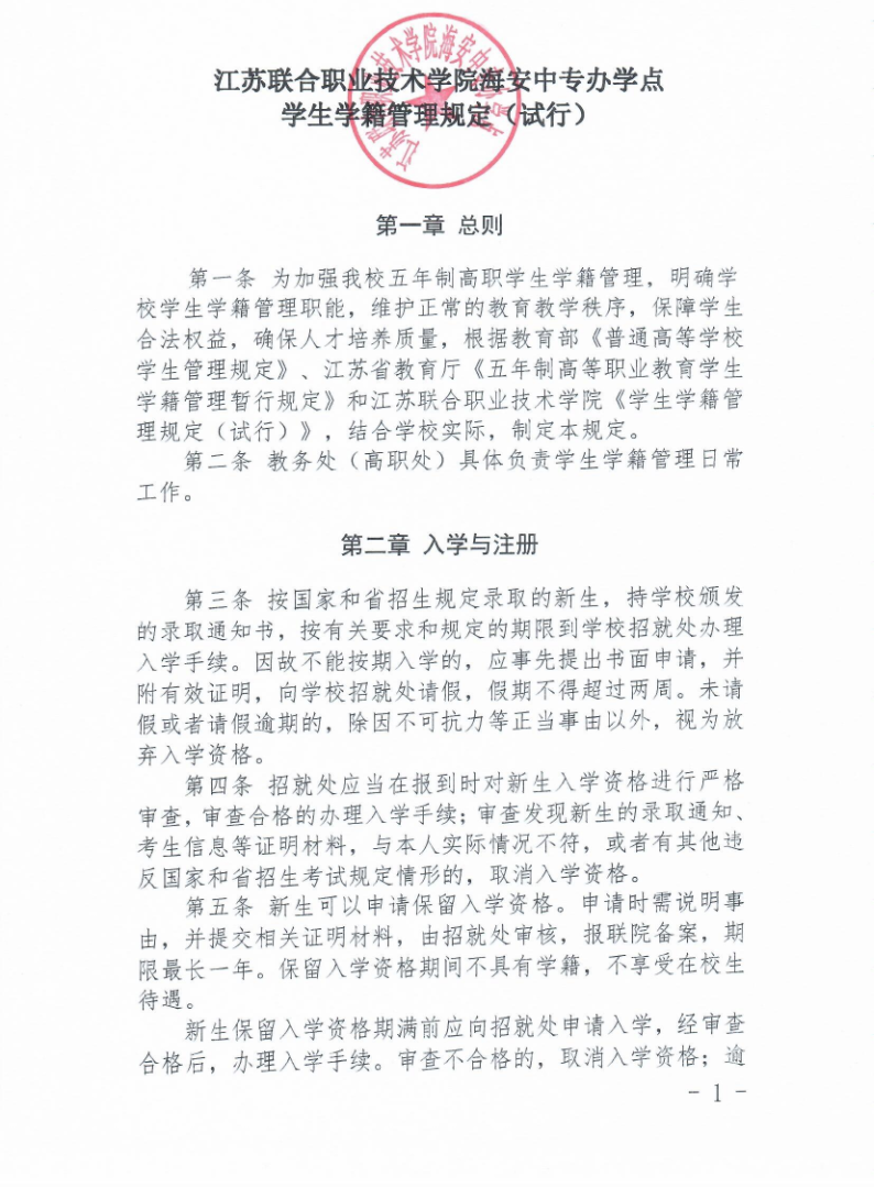 江苏联合职业技术学院海安中专办学点学生学籍管理规定(试行)