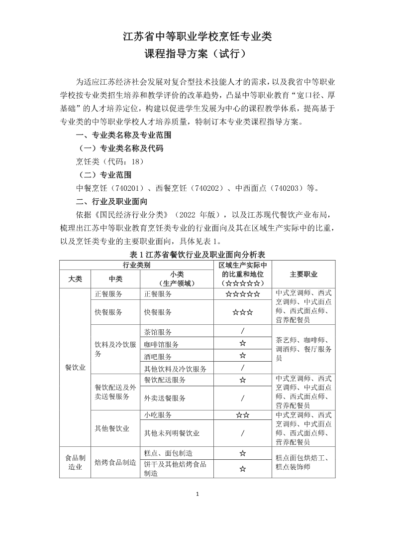 江苏省中等职业学校烹饪专业类课程指导方案(试行)