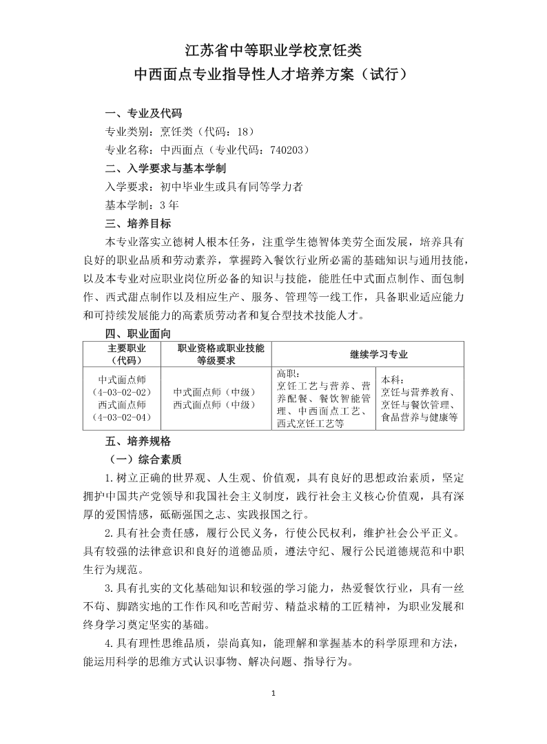 江苏省中等职业学校烹饪类中西面点专业指导性人才培养方案(试行)