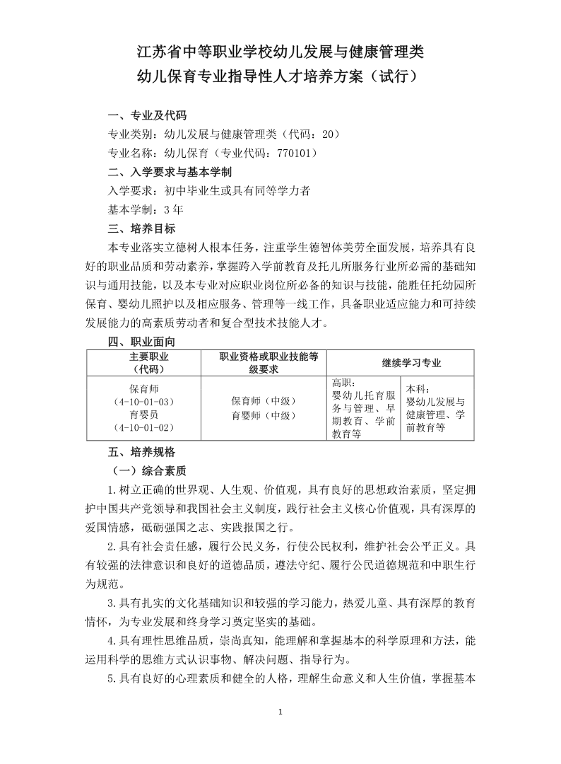江苏省中等职业学校幼儿发展与健康管理类 幼儿保育专业指导性人才培养方案(试行)