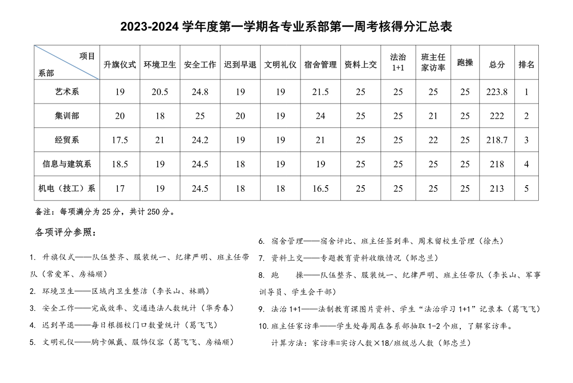 2023-2024学年度第一学期各专业系部第一周考核得分汇总表