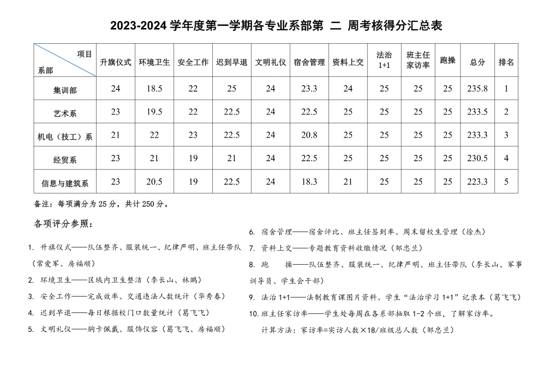 2023-2024学年度第一学期各专业系部第二周考核得分汇总表