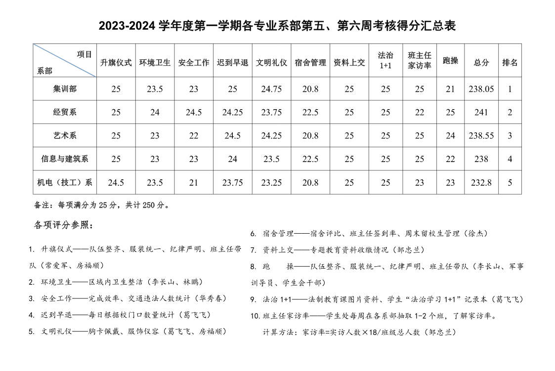 2023-2024学年度第一学期各专业系部第五、第六周考核得分汇总表