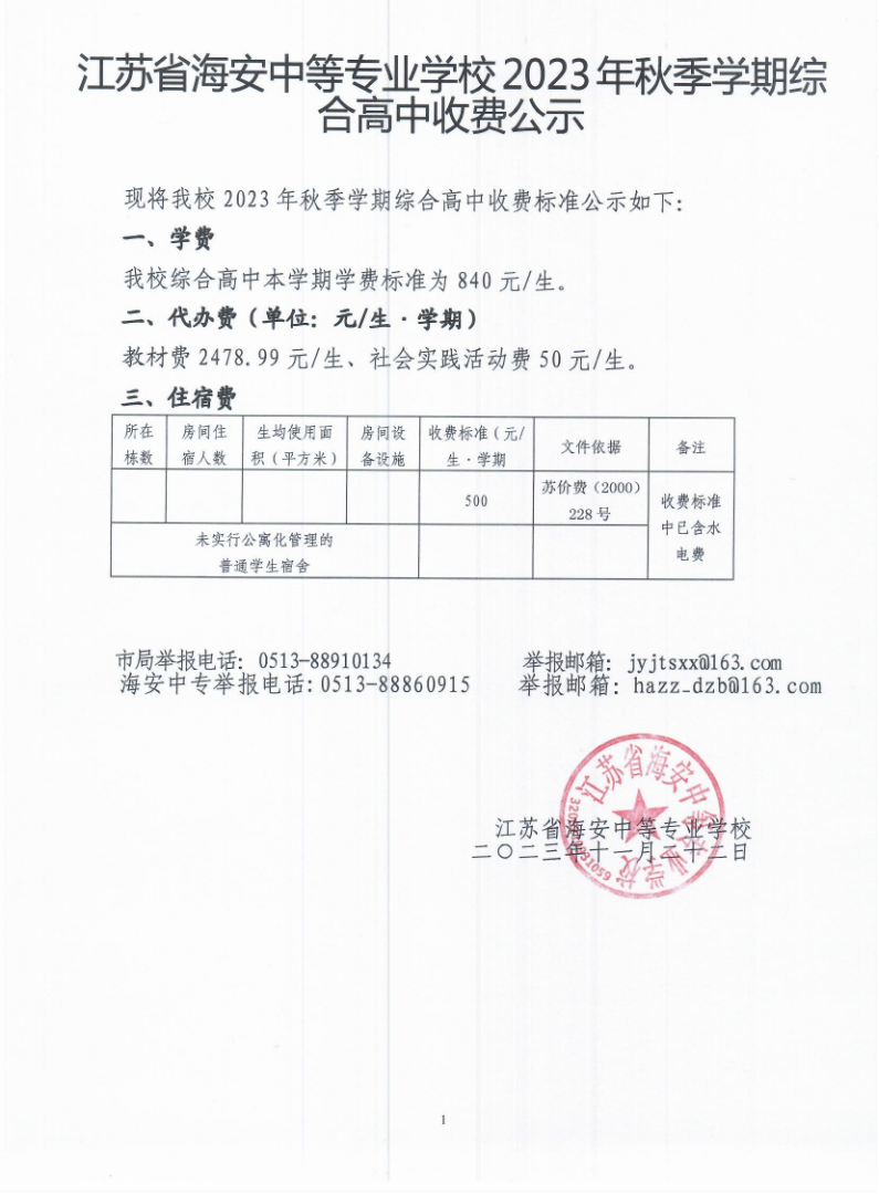 江苏省海安中等专业学校2023年秋季学期综合高中收费公示