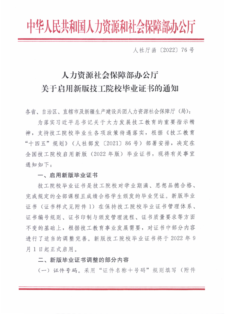 人力资源社会保障部办公厅关于启用新版技工院校毕业证书的通知